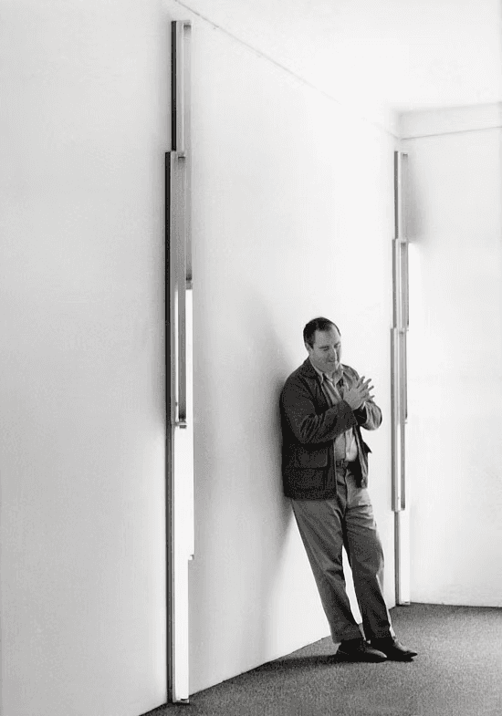 Dan Flavin était un artiste américain influent, pionnier du minimalisme et de l’utilisation de la lumière comme médium. Il a produit une œuvre singulièrement cohérente et prolifique, laissant un héritage important et durable qui a changé le cours de l’art du XXe siècle. En 1933, Daniel Nicholas Flavin Jr. naît à Queens, New York, dans une famille catholique irlandaise. Il est contraint d’étudier pour devenir prêtre au séminaire préparatoire de l’Immaculée Conception à Brooklyn. Il se souvient : « Bientôt, la religion m’a été imposée pour anéantir tout optimisme enfantin que je pouvais encore avoir »¹. Par la suite, il s’engage, avec son frère jumeau David, dans la branche météorologique de l’Armée de l’air américaine. Durant son service militaire, Flavin développe un intérêt pour l’art, qu’il poursuit grâce au programme d’extension de l’Université du Maryland en Corée. À son retour à New York en 1956, il poursuit cette passion en fréquentant la Hans Hofmann School of Fine Arts, en étudiant l’histoire de l’art à la New School for Social Research, avant de terminer ses études à l’Université Columbia avec un cours de dessin et de peinture. Les premières œuvres de Flavin reflètent son intérêt pour l’expressionnisme abstrait. Dès 1959, il commence à assembler des collages à partir d’objets trouvés dans la rue, notamment des boîtes de conserve écrasées. À cette époque, le jeune artiste travaille comme employé au service courrier du Guggenheim Museum, où il fait la connaissance de l’artiste Sol LeWitt, de la critique et commissaire Lucy Lippard, du peintre minimaliste Robert Ryman et de l’historienne de l’art Sonja Severdija, qu’il épouse deux ans plus tard. En 1961, il présente sa première exposition personnelle de collages et d’aquarelles à la Judson Gallery de New York. Cet été-là, alors qu’il travaille au Musée d’Histoire Naturelle, Flavin commence à esquisser des sculptures faites de lumière électrique. La même année, il réalise ses premières assemblages qu’il appelle « Icons » : huit peintures monochromes entourées d’ampoules électriques, dont une est dédiée à son frère David, récemment décédé. La référence aux icônes est emblématique de son œuvre : une exploration conceptuelle inlassable de l’espace et de la lumière. « Je préfère l’art en tant que pensée plutôt qu’en tant que travail », « J’ai toujours maintenu cela. Il est important pour moi de ne pas me salir les mains. Ce n’est pas par paresse instinctive. C’est une déclaration : l’art est pensée »². À partir de 1963, Flavin travaille exclusivement avec des tubes fluorescents de fabrication industrielle, qu’il assemble différemment selon les installations. Il utilise uniquement six couleurs de lampes : rouge, jaune, bleu, vert, rose et ultraviolet ; et quatre blancs : blanc froid, blanc chaud, lumière du jour et blanc doux. Son attachement aux formes simples, l’utilisation de matériaux industriels et la portée symbolique de ses œuvres rapprochent sa démarche de celles de Donald Judd et Sol LeWitt. Tout au long des années 1960, en expérimentant la lumière, la couleur et l’espace, Flavin rejette la production en atelier et refuse de qualifier ses œuvres de « travaux » ou de « sculptures », préférant les désigner comme des « propositions » ou des « installations ». La plupart de ses œuvres sont intitulées Untitled mais accompagnées d’une dédicace entre parenthèses, comme ses célèbres Monuments for V. Tatlin, un hommage au peintre, sculpteur et architecte russe Vladimir Tatlin. En 1970, Flavin commence à délivrer des certificats sur papier millimétré, comprenant des schémas de l’œuvre, des descriptions écrites et sa signature. Son objectif était de protéger les œuvres et d’en assurer la préservation. À la fin des années 1970, l’artiste initie une collaboration avec la Dia Art Foundation, qui aboutit à la réalisation de plusieurs installations permanentes in situ et à l’organisation plus récente de l’exposition itinérante Dan Flavin: A Retrospective (2004–2007). Flavin se concentre alors sur des installations de grande envergure spécifiques à des lieux aussi variés que la rotonde en spirale de Frank Lloyd Wright au Guggenheim Museum ou une ancienne gare du XIXe siècle à Berlin, aujourd’hui transformée en musée de l’art contemporain (Für Gegenwart). Bien que l’échelle de ses œuvres ait augmenté, les matériaux, l’esthétique et la réflexion présents dans ses premières expérimentations lumineuses demeurent intacts. L’artiste meurt à Riverhead, Long Island, New York, le 29 novembre 1996. À sa mort, de nombreuses œuvres prévues restent non réalisées et non certifiées ; la succession Flavin décide de ne pas émettre d’œuvres non certifiées de son vivant. Quelques installations seront achevées à titre posthume, notamment l’impressionnante Chiesa di Santa Maria Annunciata à Milan. Il reste l’un des artistes les plus marquants et innovants de son époque, et ses installations sont aujourd’hui considérées comme des icônes du minimalisme. ¹ Dan Flavin, « … in daylight or cool white. » un croquis autobiographique (to Frank Lloyd Wright who once advised Boston’s “city fathers” to try a dozen good funerals as urban renewal), Dan Flavin: The Complete Lights, 1961-1996, 2004, p. 189. ² Dan Flavin, interviewé par Phyllis Tuchman, Dan Flavin: A Retrospective, 2004, p. 194.